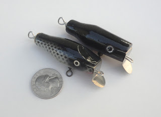 I am guessing I made these around 2000 or 2001. I was fishing golf course ponds quite a bit in the summer and was dragging my brother along. There was lots of juvenile bait around, and the fish were sometimes a bit finicky. I was having no problem fishing the early incarnations of the 3" pike (then nicknamed the choopy mini), and catching fish. My brother was fishing a lighter rod than I was, and the choopy mini was a bit heavy for his tackle, so I made these little swimmers for him. Apparently I made a little danny and pikie. As you can see, they are pretty small, about the size of two quarters. We were fishing pretty late at night, so the colors were dark. I don't remember much about how they swam, but I do remember my brother beating up on the largemouth's pretty good one night with them. Nothing huge, but a ton of action. I think the imitated the little minnows and other juvenile bait that comes to the surface at night, but I think they also imitated the bugs that were hatching or hanging out on the surface as well.
