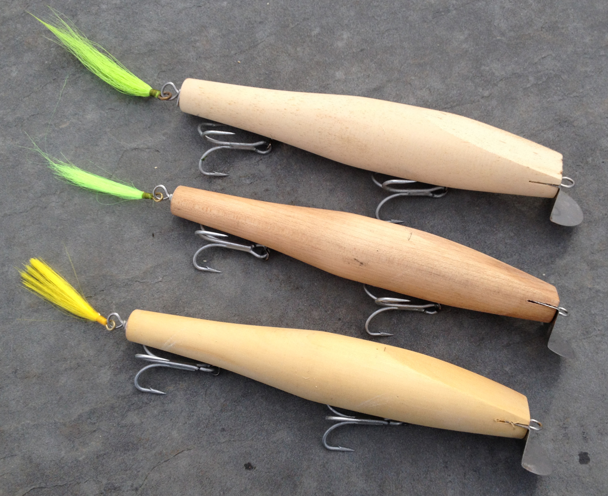 Middle Proto: This one was made of maple and a bit thinner than the others. I wanted to see if the heavier wood and thinner profile made it swim deeper. It did, but it didn't thump in the current like the others.
