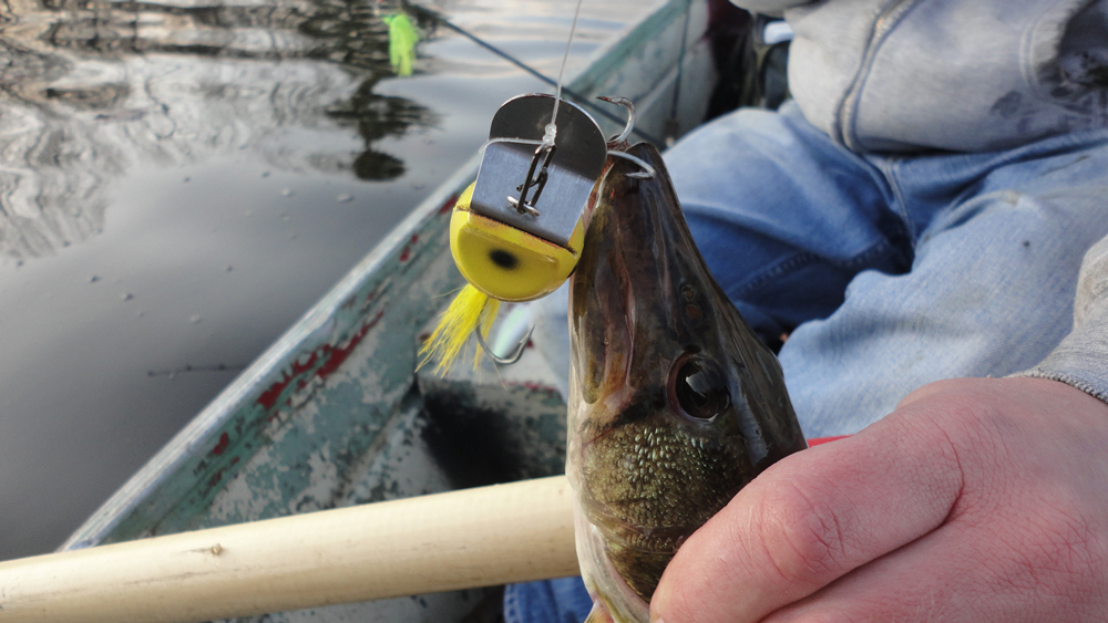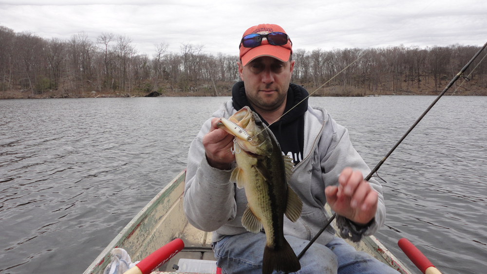 We decided to drift into some shallower coves with the assumption that the fish were holding in the warmer shallow water. As we headed over I clipped on a 3" Pike and tuned it to fish about 10-12" deep. We were passing over some weed beds and I thought the bass might be holding in the top of the weeds. On my second or third cast I had a fish on that ended up being the pool winner for the day. A nice 3 lb. largemouth.
