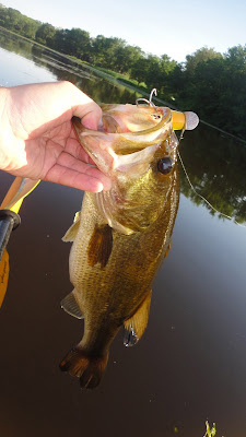 I was fishing some weed lines where the millfoil was starting to reach the surface, but it was sporadic enough in spots where you could still fish poppers, 3" Pikes, lil Barky's and other swimming lures. I have a lot of confidence in my lil popper in these conditions and it was the workhorse this morning as well. I caught a few largemouth, and missed a few others while fishing the lil popper on the edges of the millfoil.